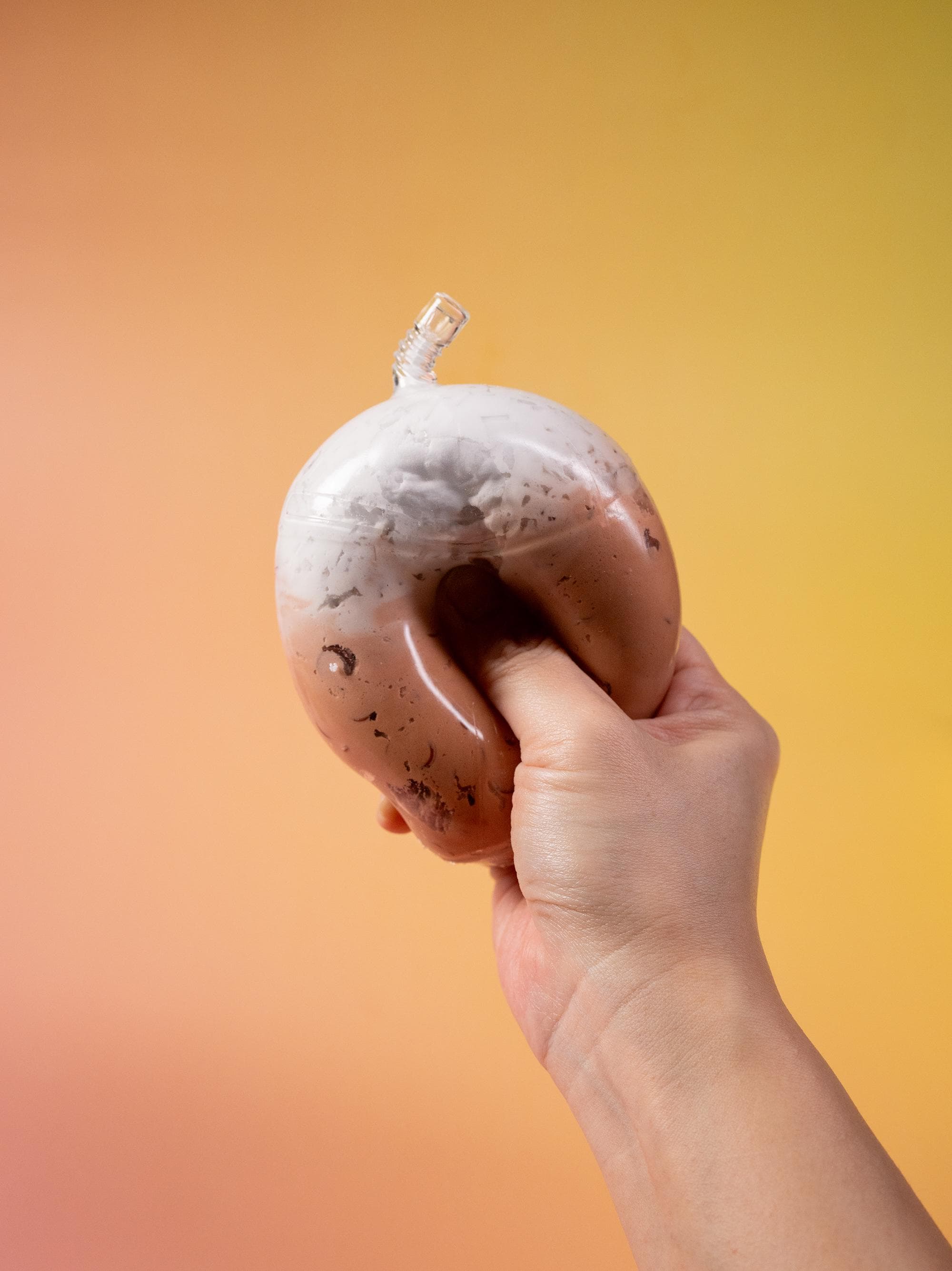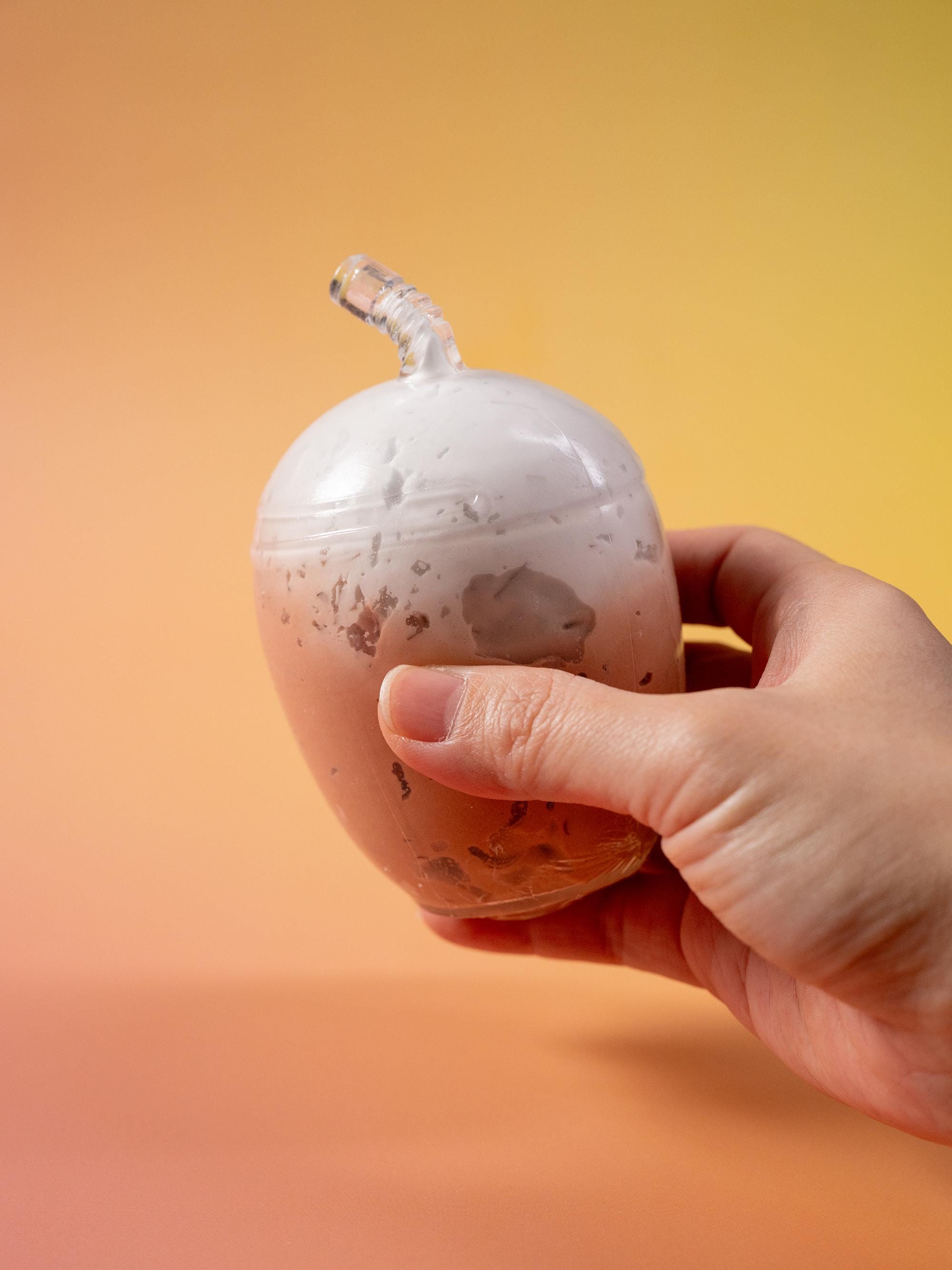 The top layer is “milk foam” style — white clay with clear ice-bar pieces for a soft yet lightly sandy texture.